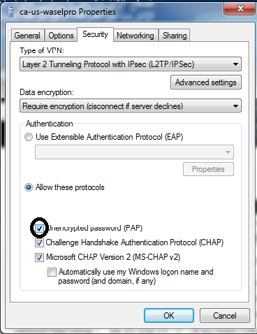 Note: You need to check the "Allow these protocols" radio button and "Unencrypted password (PAP)".